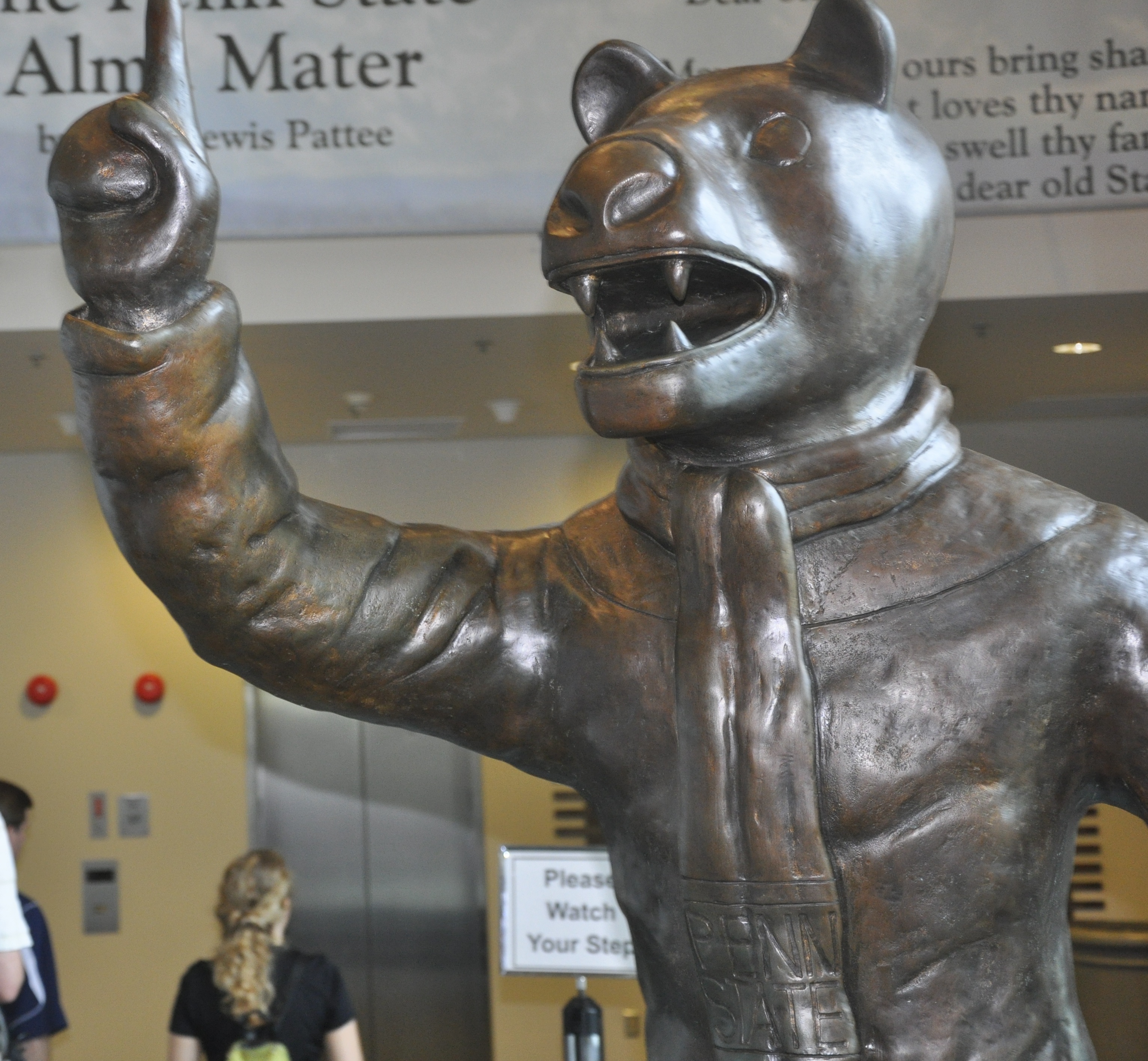 Inspiration came on an early trip to the Penn State All-Sports Museum, where a statue of the Nittany Lion greets visitors in the lobby. The bronze Lion was “standing there throwing up the number one,” Franklin says. The image, and the idea, stuck.
