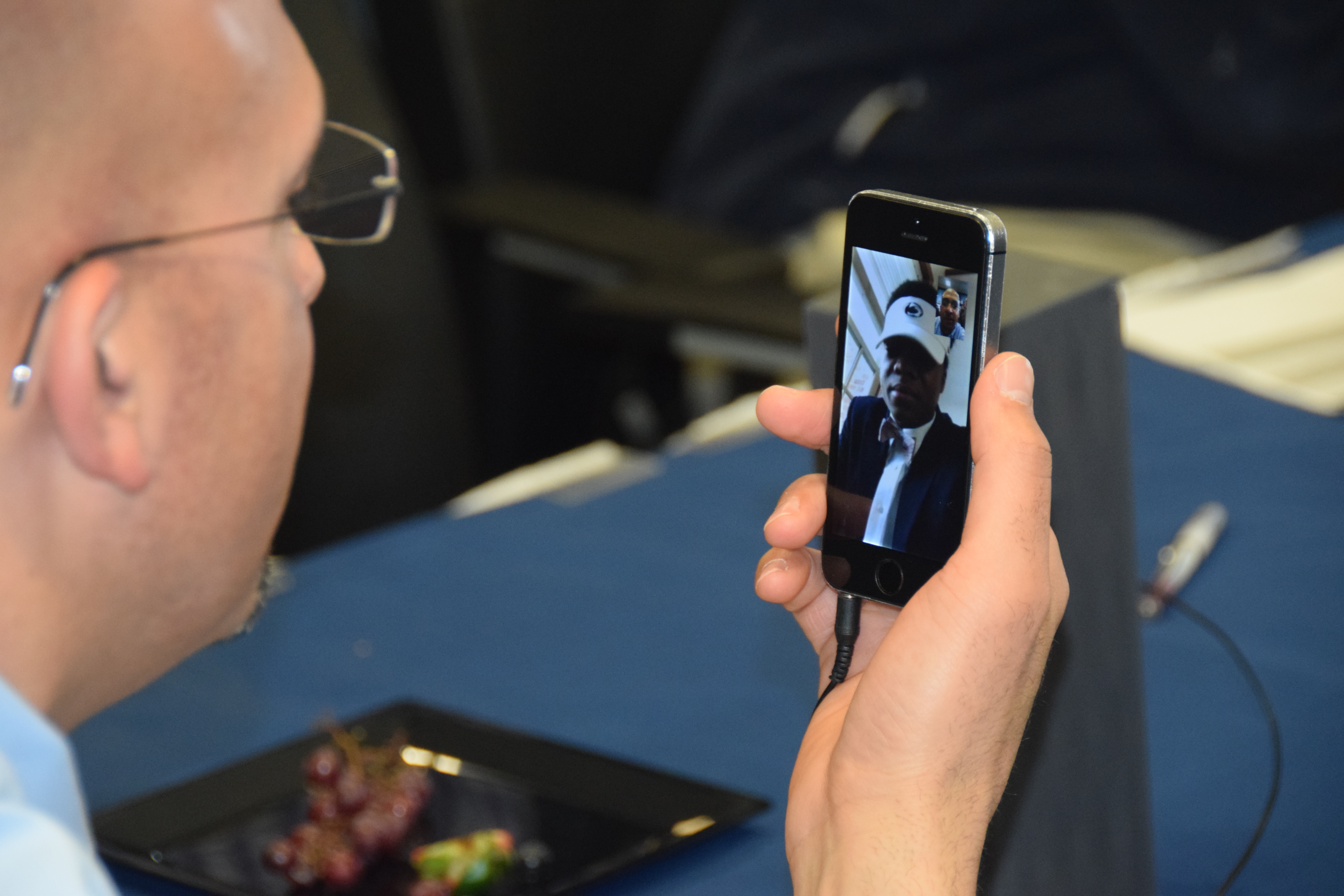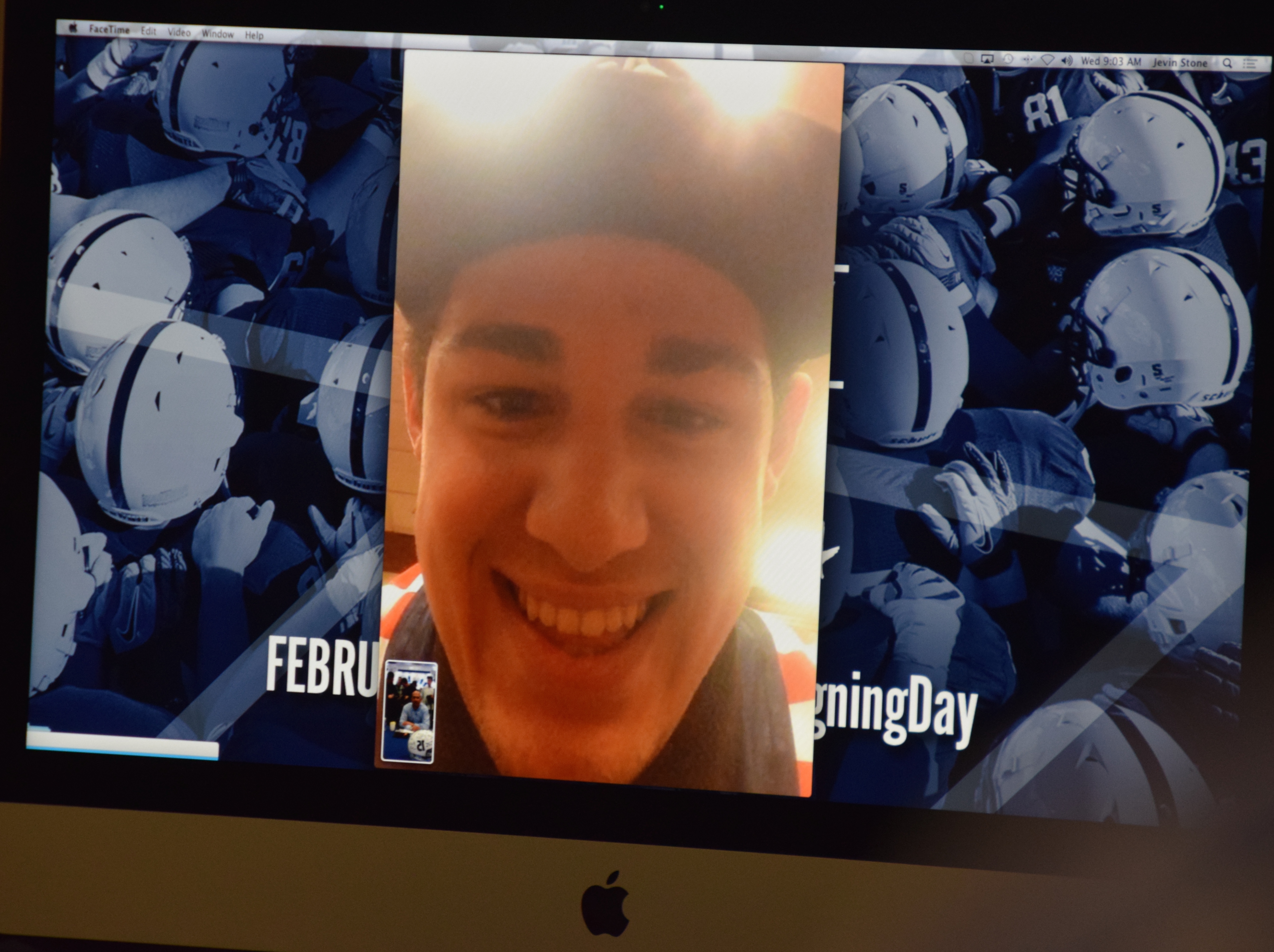That’s James Franklin, above, seen in the reflection of a computer monitor while dialing up a FaceTime call on his phone. On the other end of the line was Garrett Taylor (seen below on Franklin’s iPhone), one of the 25 future Nittany Lions who made their college choice official on Wednesday morning. Behind Franklin in the monitor’s reflection, you can get a sense of the crowd (and the balloons) crammed into the Lasch Building’s second-floor waiting area for the second Signing Day since Franklin’s arrival.