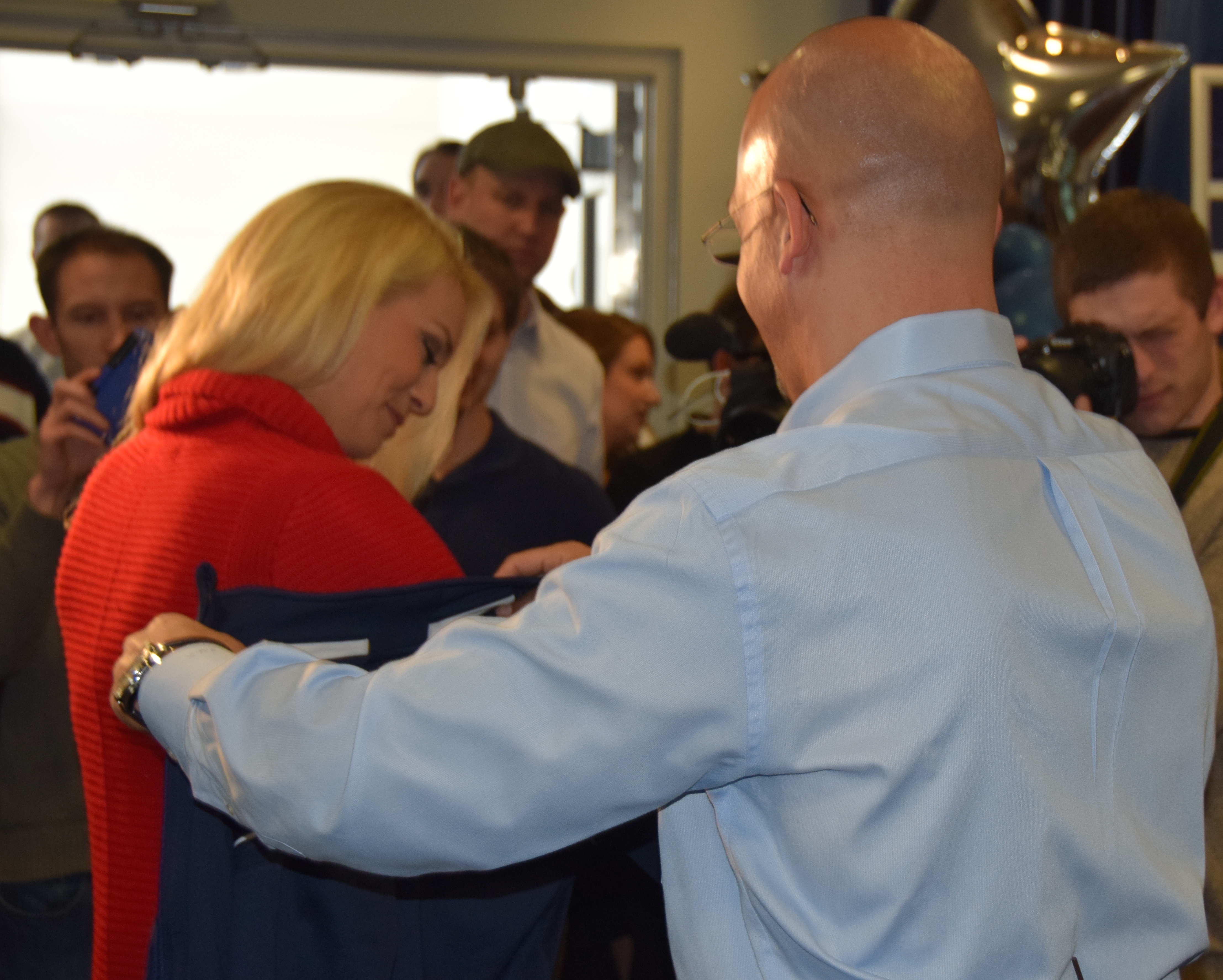 Yes, another screen: This time it’s Franklin watching ESPN’s Britt McHenry doing a standup from the balcony of the Lasch Building weight room. Twenty minutes later, Franklin drafted McHenry to add a recruits’ name to the “draft board,” but only after she agreed to put on a blue jacket. As the @PennStateFball account tweeted, the event had a strict policy of #NoRedAllowed.