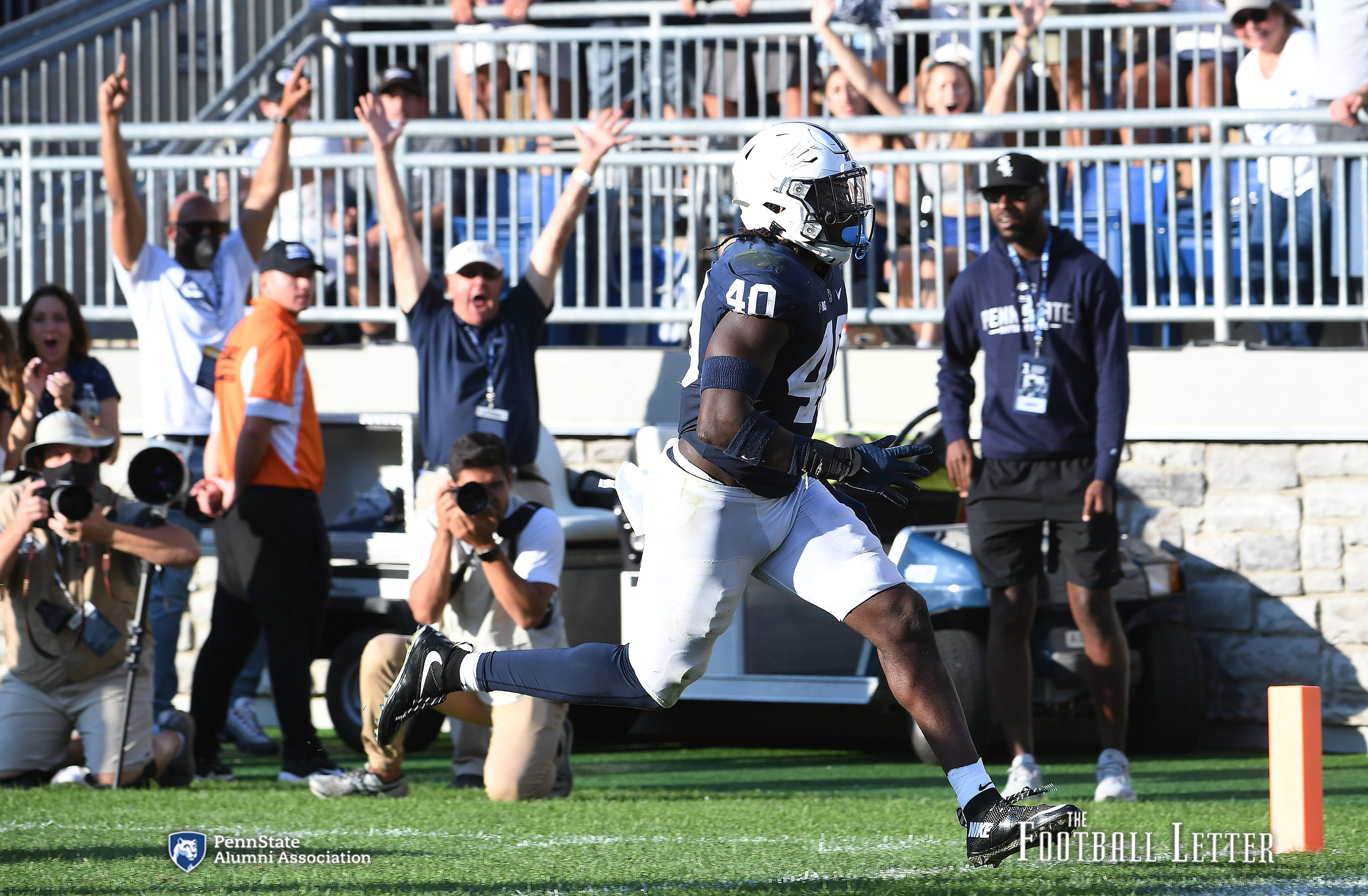 Penn State linebacker-turned-defensive end Jesse Luketa snared a one-handed interception and returned it for a touchdown during Penn State’s home opener against Ball State. The Nittany Lions secured a 44-13 win for the program’s 300th victory at Beaver Stadium. Photo credit: Steve Manuel.
