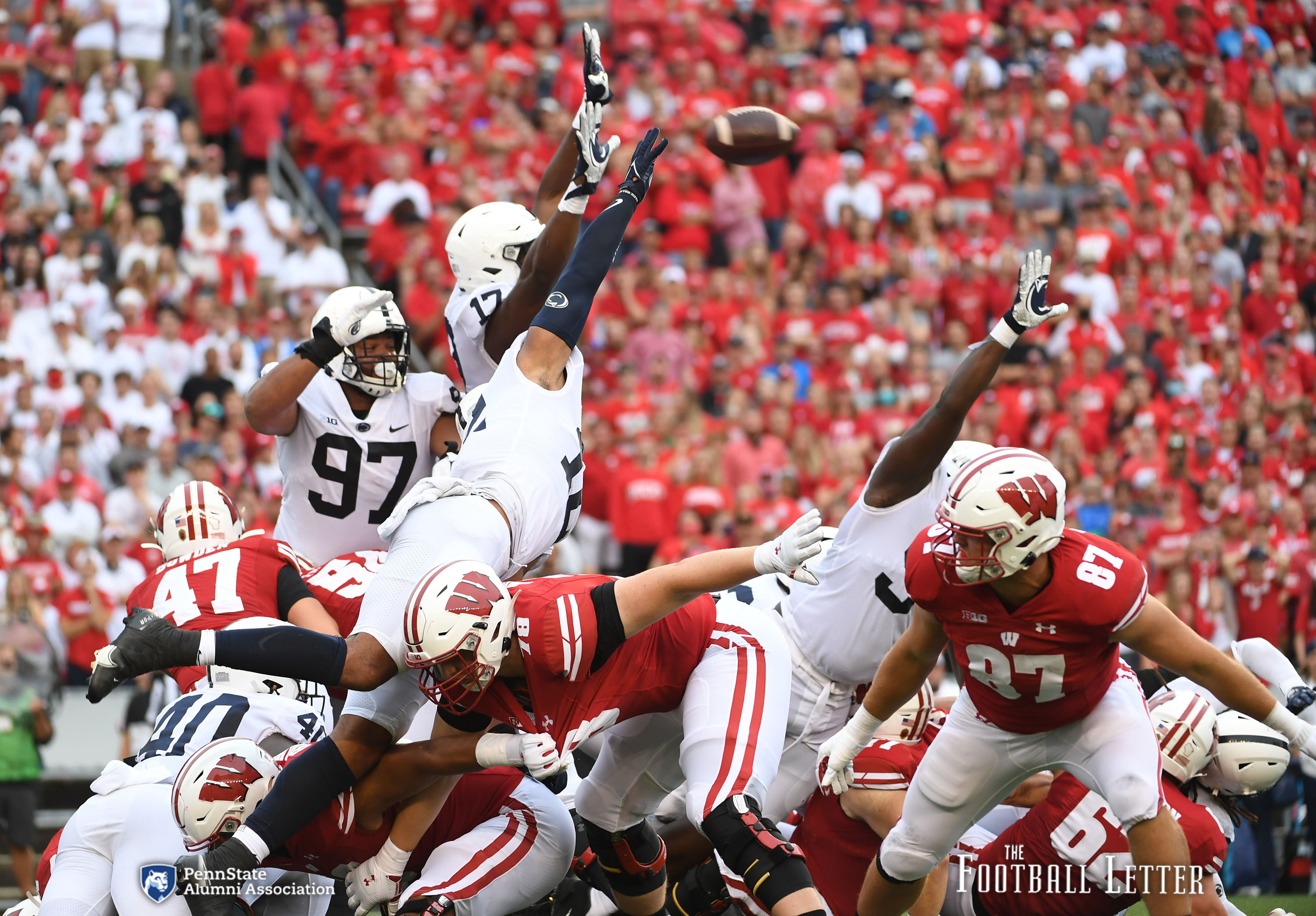 Senior defensive end Arnold Ebiketie (17) has had an immediate impact for Penn State, blocking a field goal and recording a sack in Madison a few weeks ago. Photo credit: Steve Manuel