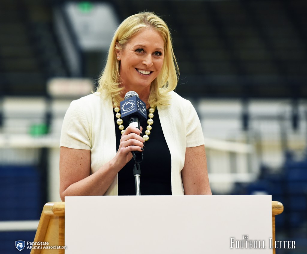 Katie Schumacher-Cawley looked happy Tuesday afternoon at Rec Hall. That made sense. She was standing in a building where she built an impressive career as a two-time All-American for Penn State, totaling 1,310 kills, 772 digs, and 299 blocks. She was speaking on behalf and for her alma mater (2002), for a program she helped lead to a national championship in 1999, a program she returned to after nearly a decade away.