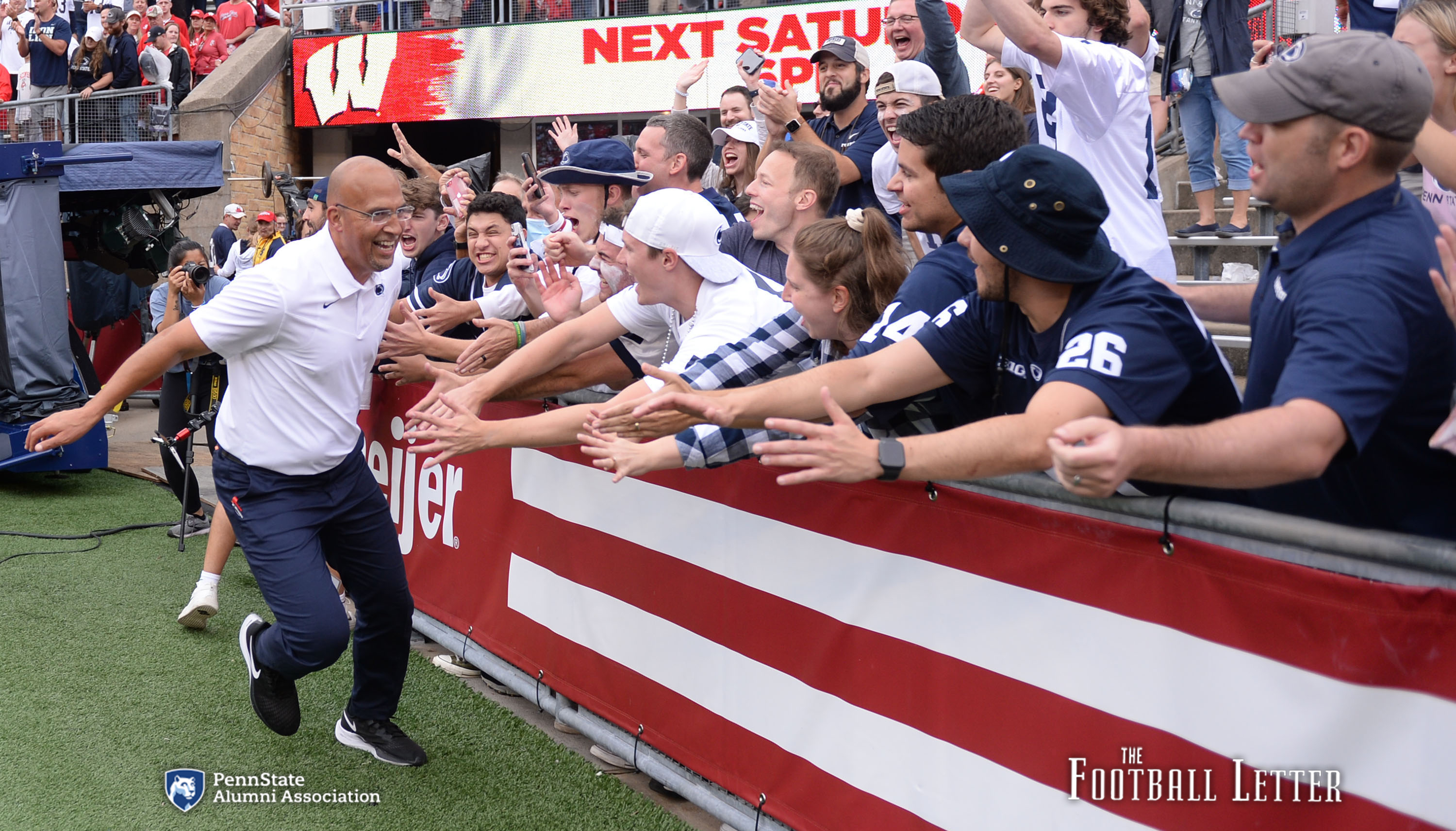 So, after Penn State knocked off the 12th-ranked team in the nation on the road on Saturday afternoon, the Penn State head coach went looking for fans to celebrate with. He didn’t have to go far, just to the first few rows of Camp Randall Stadium, home of the Wisconsin Badgers.