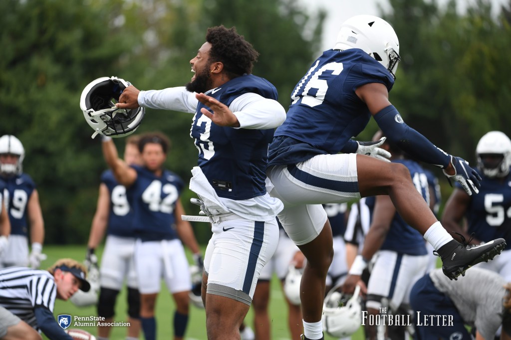 Linebacker Ellis Brooks (left) and safety Ji’Ayir Brown celebrate during Penn State’s second fall practice Saturday, Aug. 7, at the Lasch Practice Fields. The Nittany Lions opened fall camp the day before, and earlier on Saturday, James Franklin and the team met with the media to look ahead to the 2021 season. Photo credit: Steve Manuel